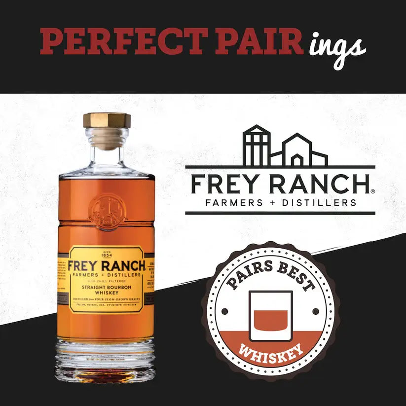 Indulge in the perfect harmony of slightly spicy yet super savory brisket and the tantalizing notes of Frey Ranch Four-Grain Straight Bourbon Whiskey with Boozy Jerky.