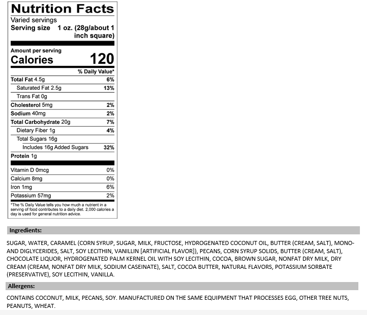 Our Fudge is always made with fresh high quality ingredients, including 100% Real Wisconsin Butter! Pecans and caramel elevate this rich and creamy Chocolate Fudge to an irresistible level. And to top it all off, we add even more pecans and drizzle it with caramel! Is your mouth watering yet? Our mouths sure are!
