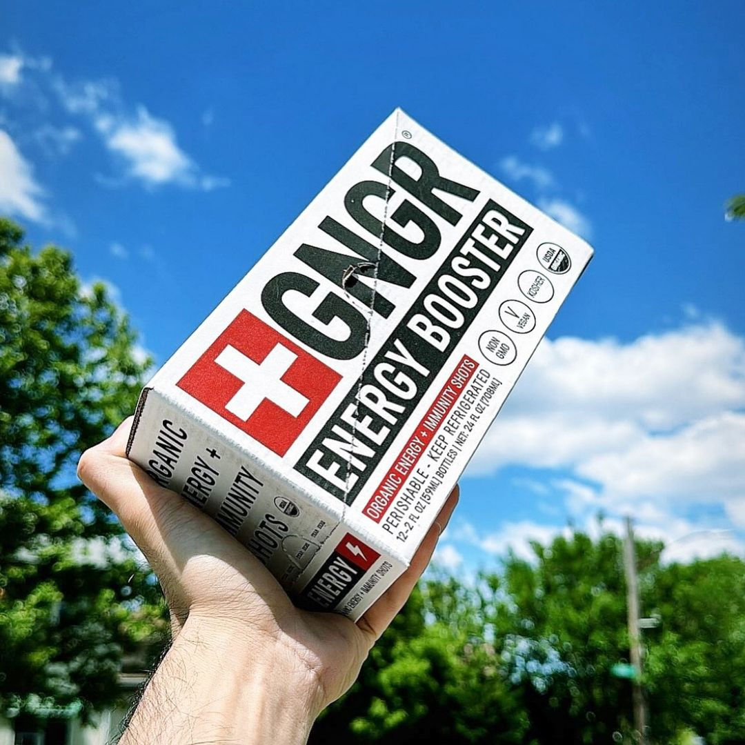 The Energy Booster Shot from +GNGR combines cold-pressed ginger juice, turmeric, and 75mg of natural caffeine from green tea for a clean, plant-based energy boost.