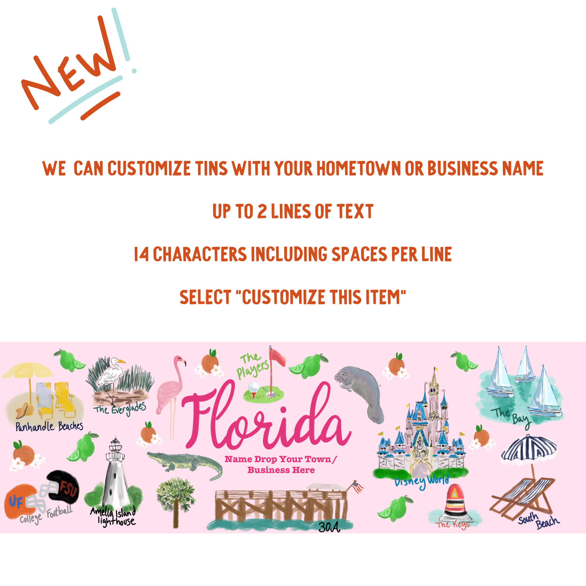 Delight your customers with gourmet snacks that are a taste of the South! This beautifully designed Florida State Gift Tin features original artwork showcasing notable cities and points of interest in Florida. It's the perfect way to celebrate local love and makes a memorable gift for any occasion. Filled with your choice of delicious Watanut Shortbread Cookies or Gourmet Nuts, this tin offers a premium treat and a touch of Southern charm.