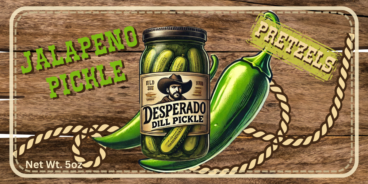 A fiery frontier favorite that packs a punch as bold as a desperado's showdown. This daring pretzel flavor blends the tangy, crisp crunch of dill pickles with the spicy kick of jalapeños, creating a taste experience that's both zesty and exhilarating.