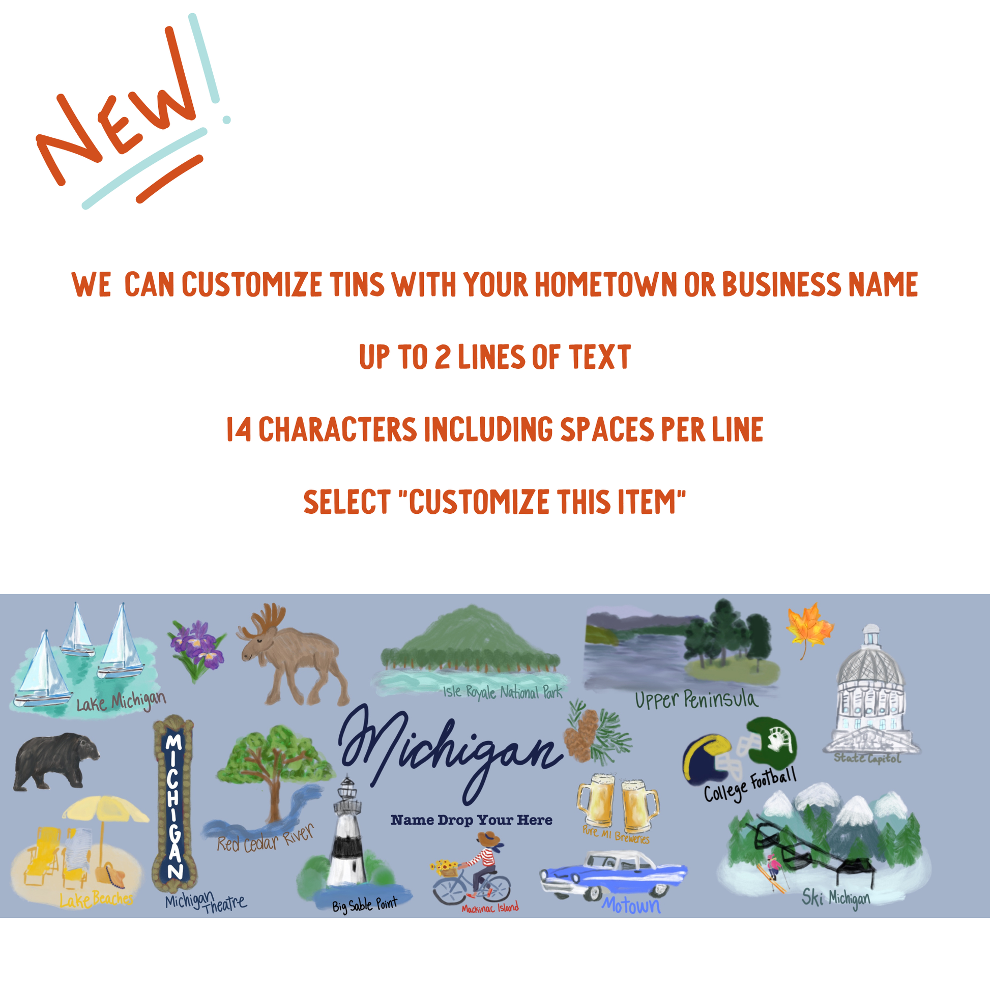 Delight your customers with gourmet snacks that are a taste of the South! This beautifully designed Michigan State Gift Tin features original artwork showcasing notable cities and points of interest in Michigan. It's the perfect way to celebrate local love and makes a memorable gift for any occasion. Filled with your choice of delicious Watanut Shortbread Cookies or Gourmet Nuts, this tin offers a premium treat and a touch of Southern charm.
