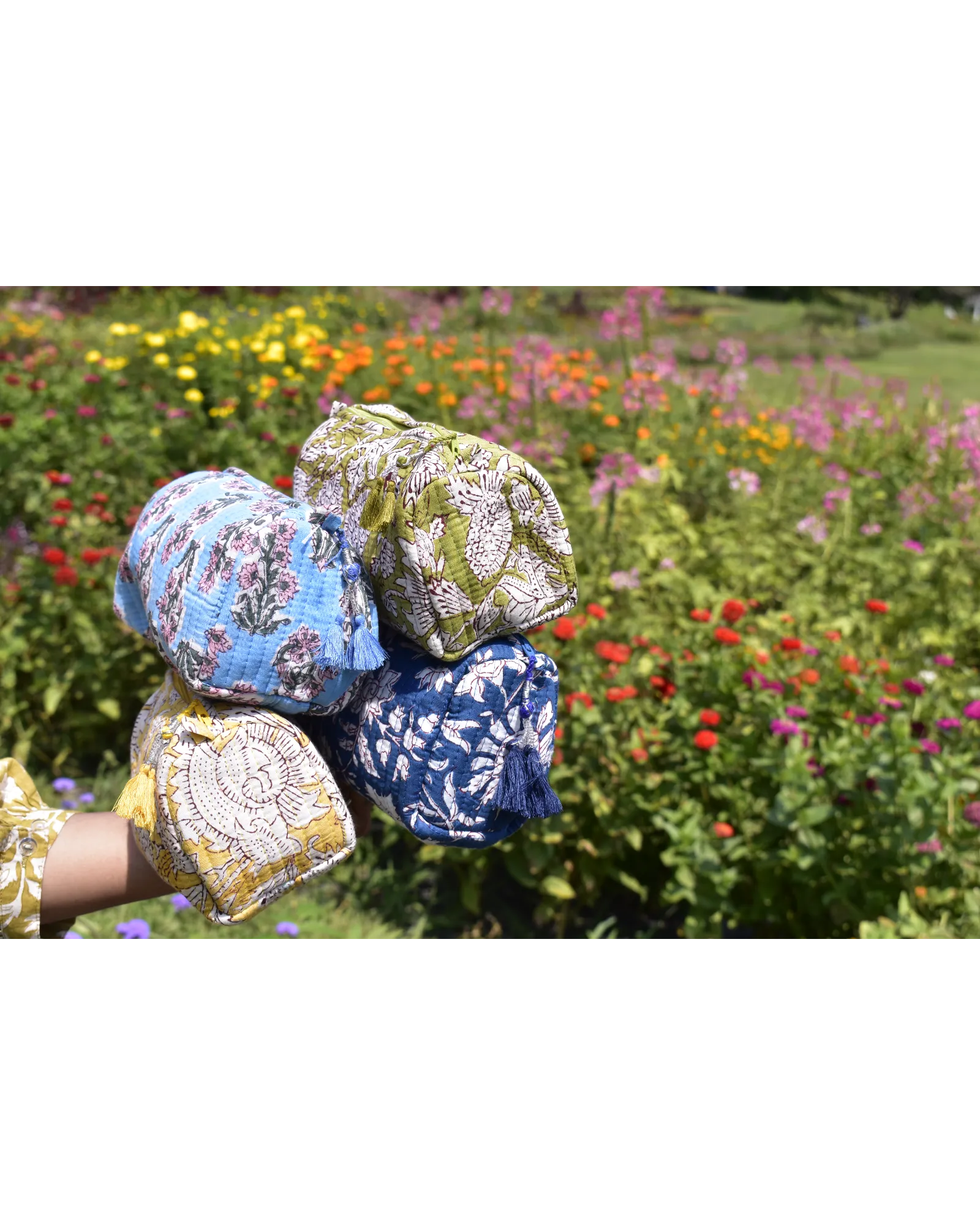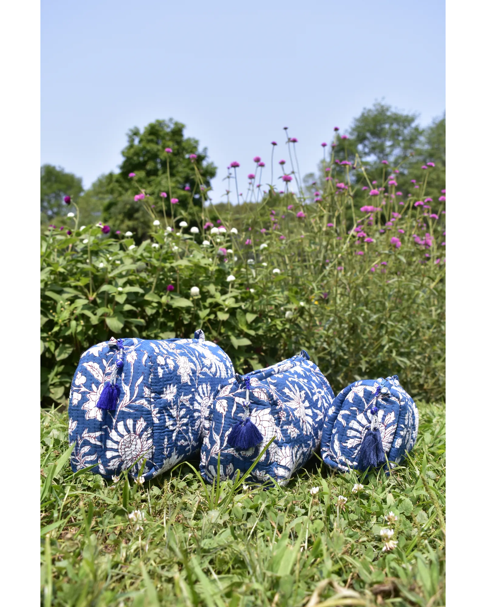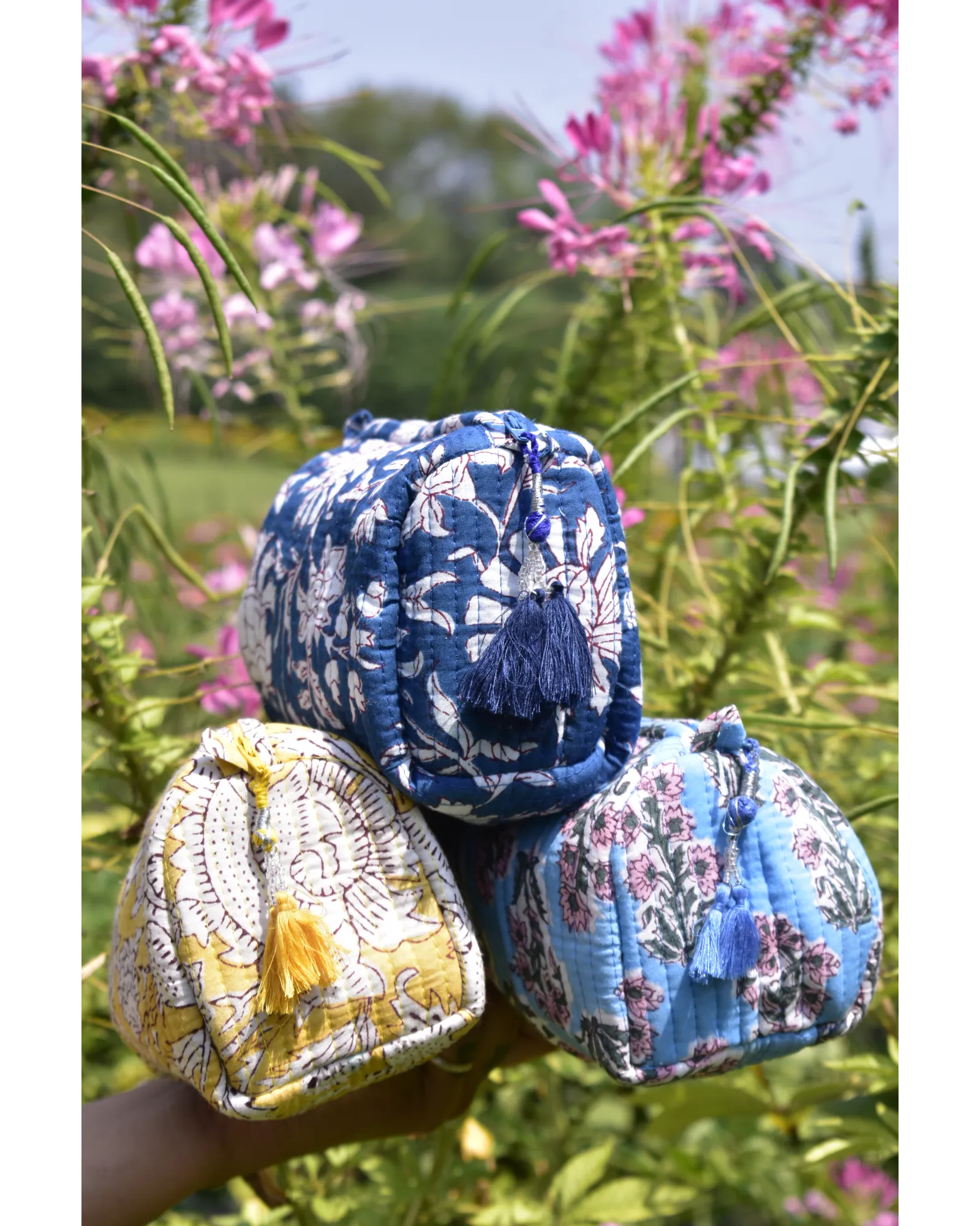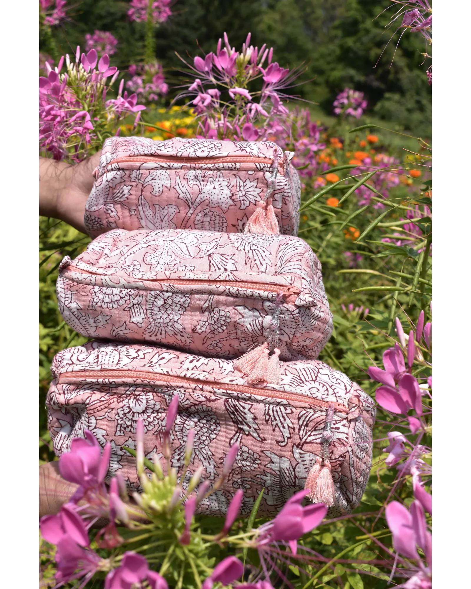 Our set of 3 nesting cosmetic pouches is the perfect companion for your travel and organization needs. Each pouch is hand block printed and features a waterproof lining and internal pockets to keep your essentials neatly organized and protected from spills.