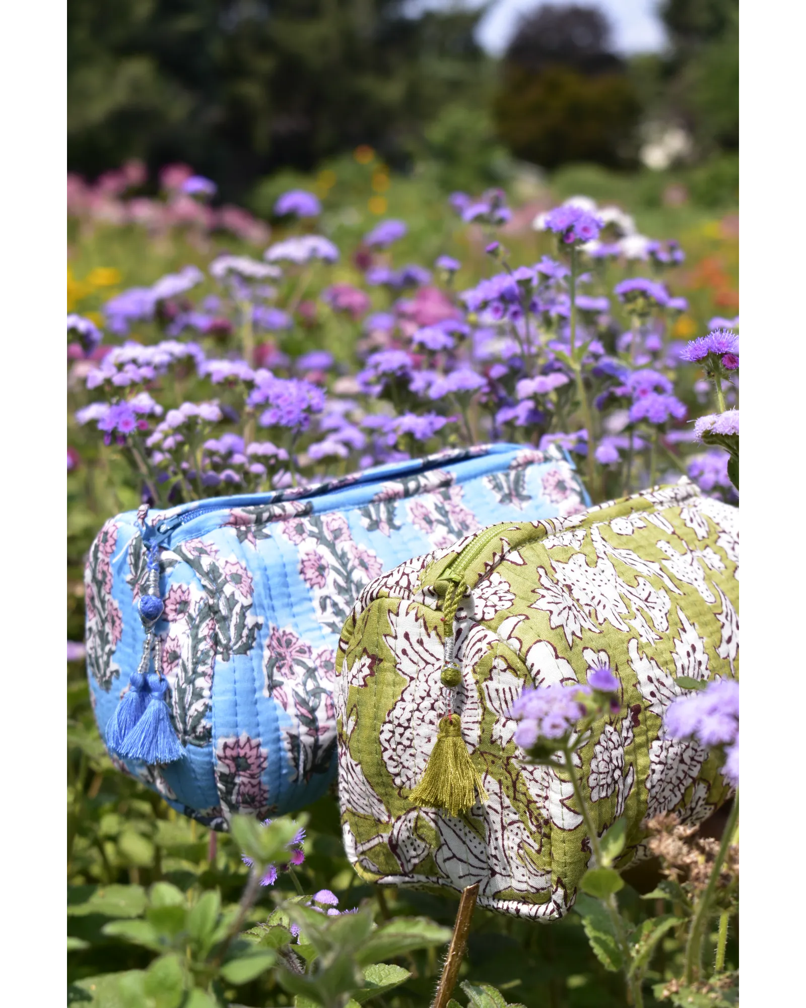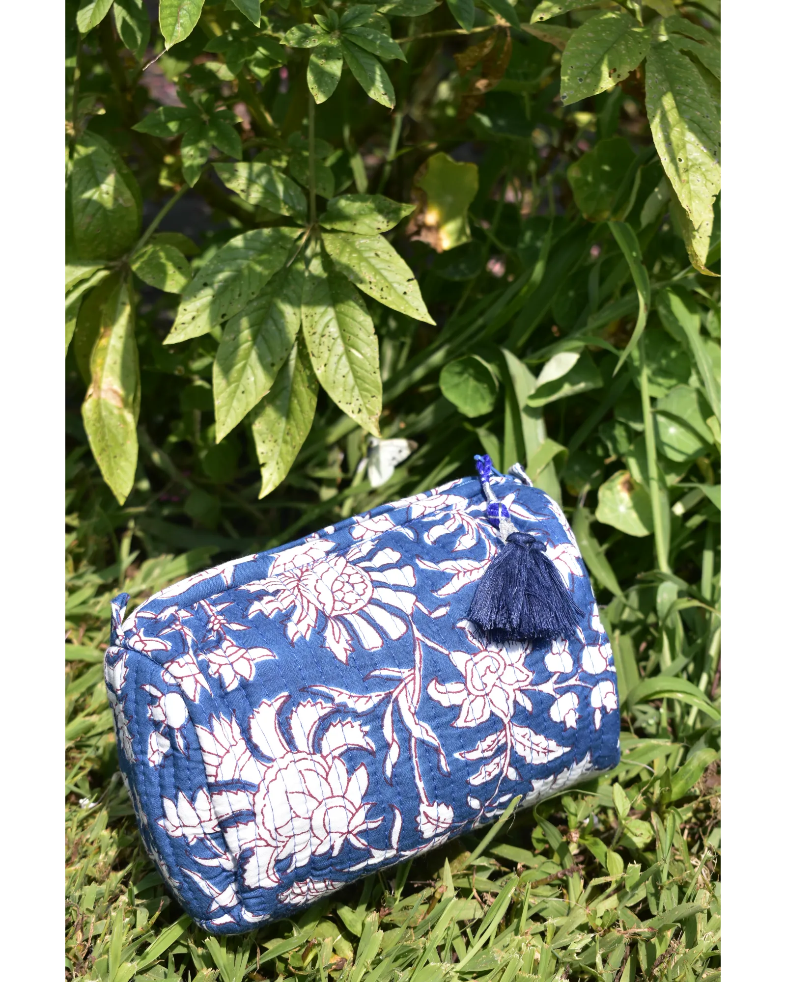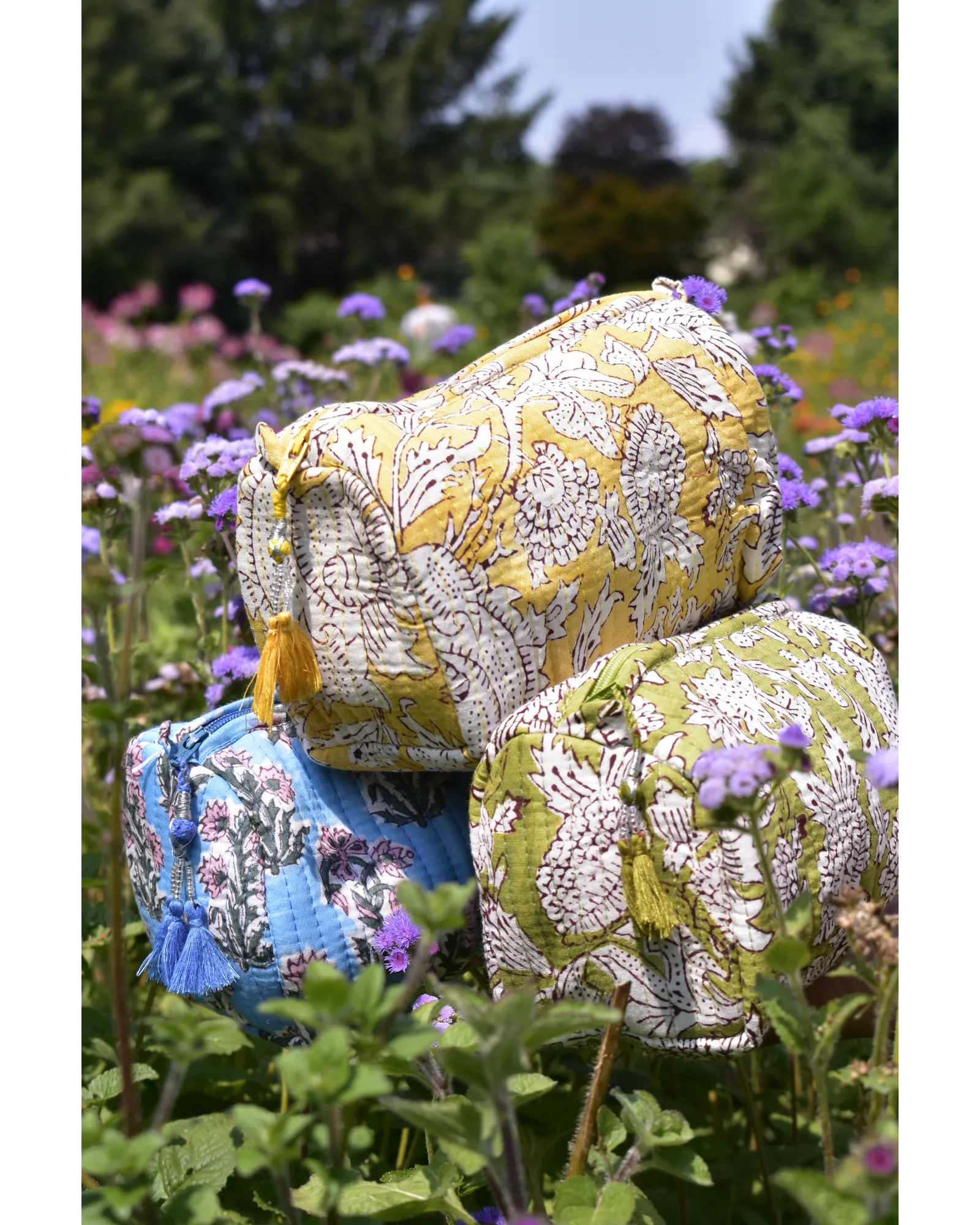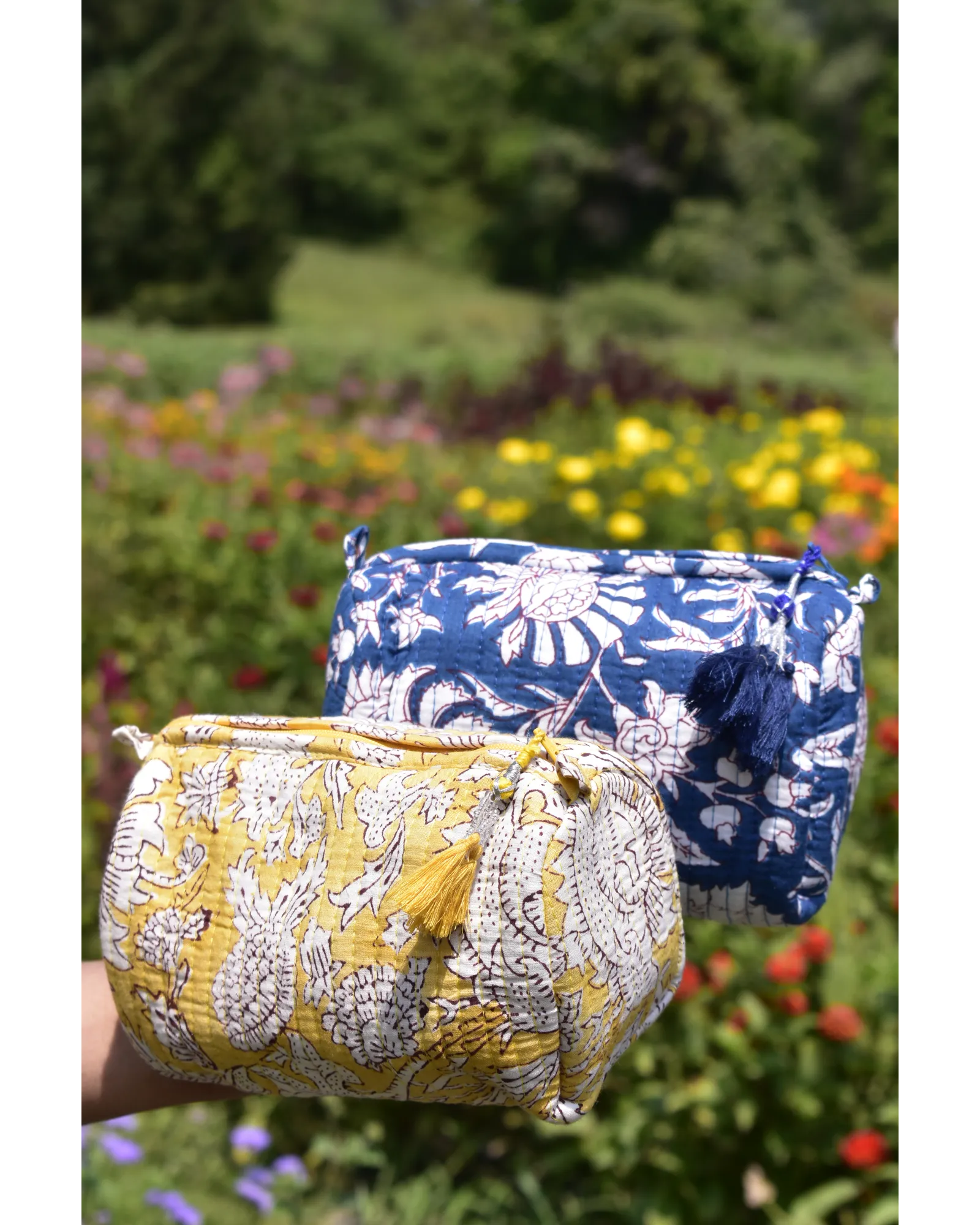 Our set of 3 nesting cosmetic pouches is the perfect companion for your travel and organization needs. Each pouch is hand block printed and features a waterproof lining and internal pockets to keep your essentials neatly organized and protected from spills.
