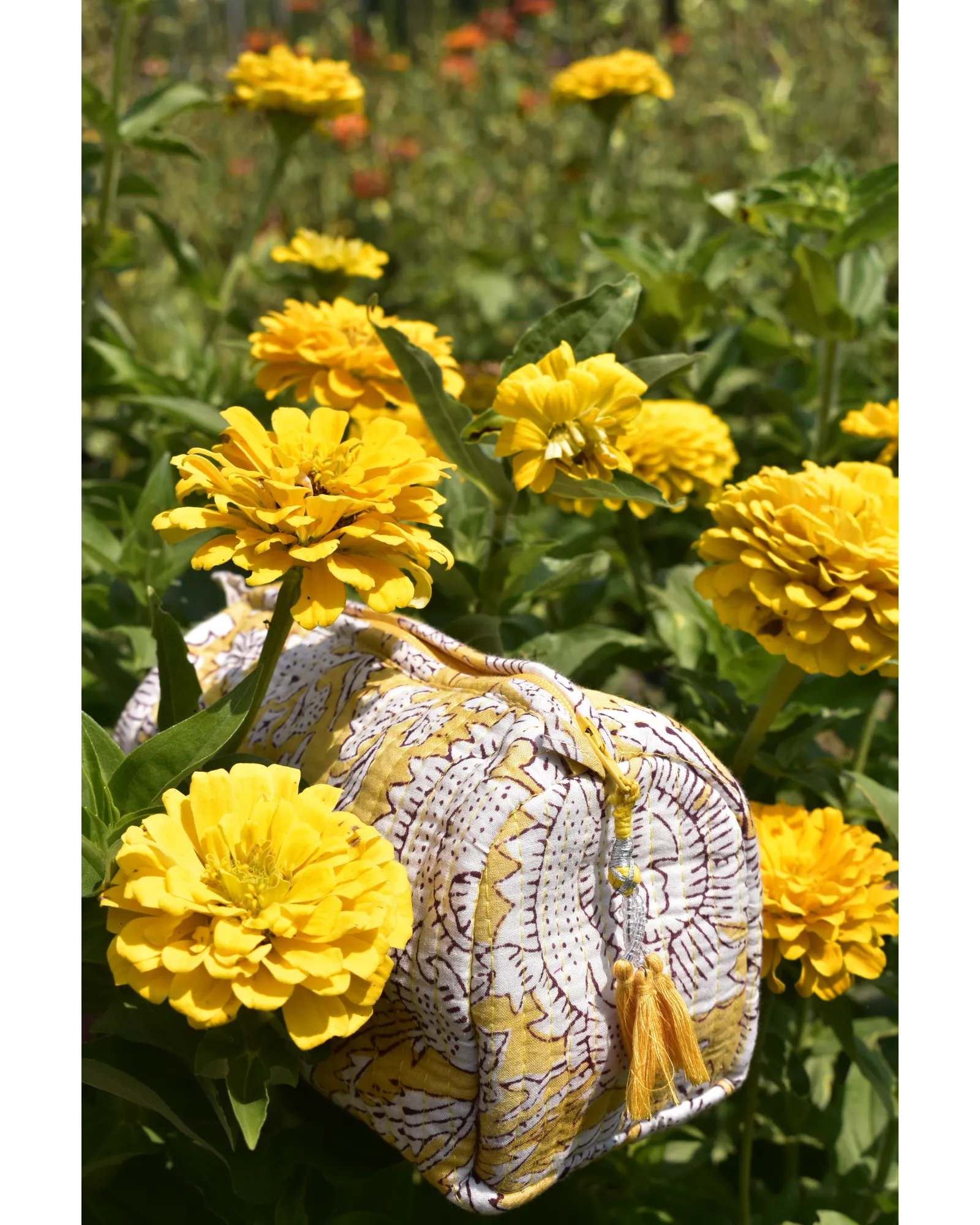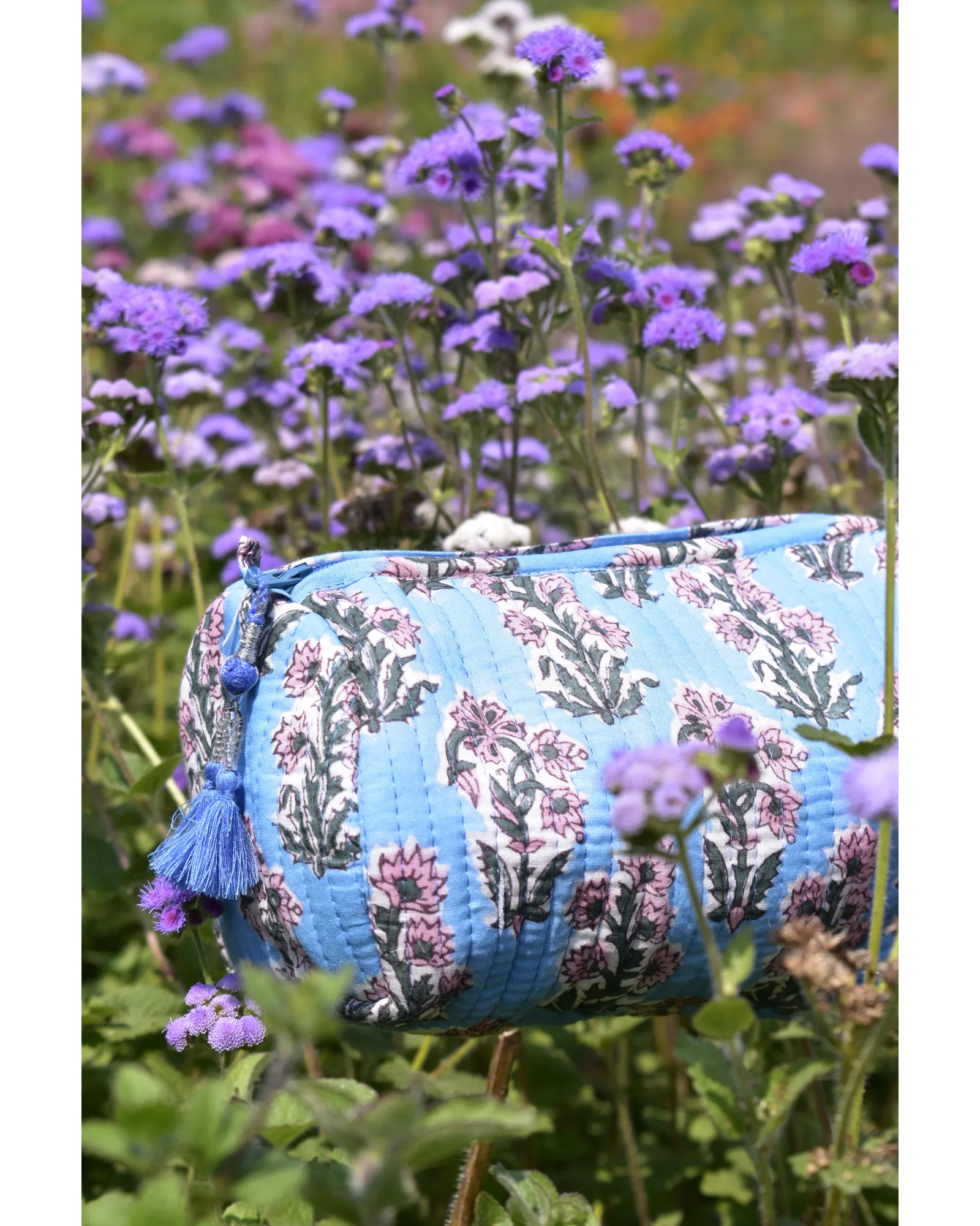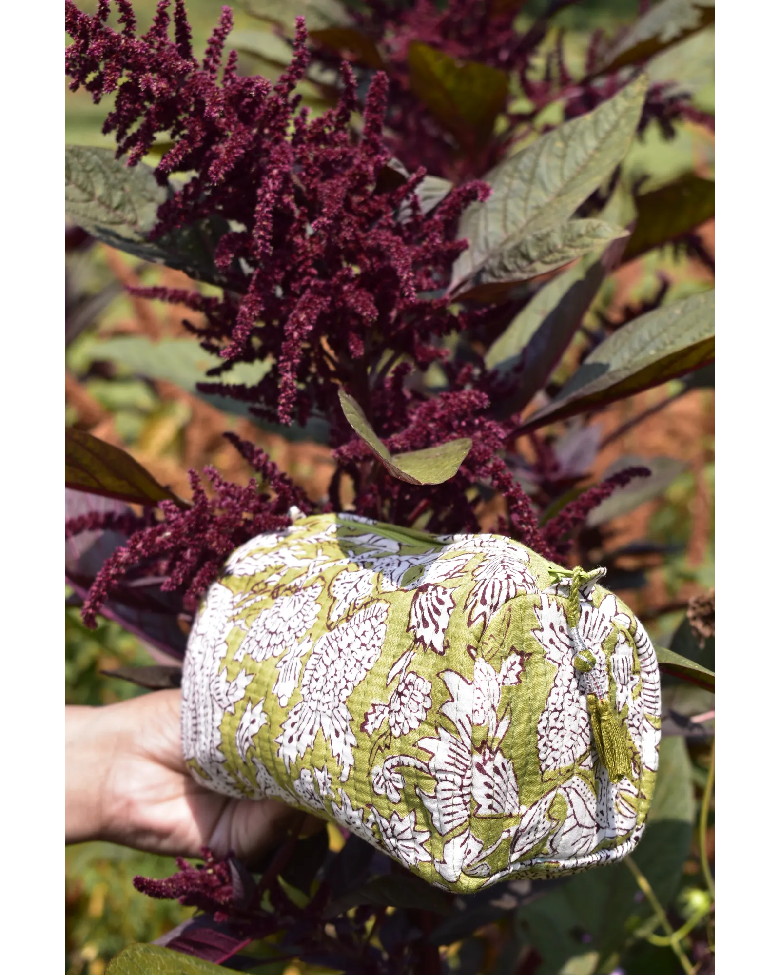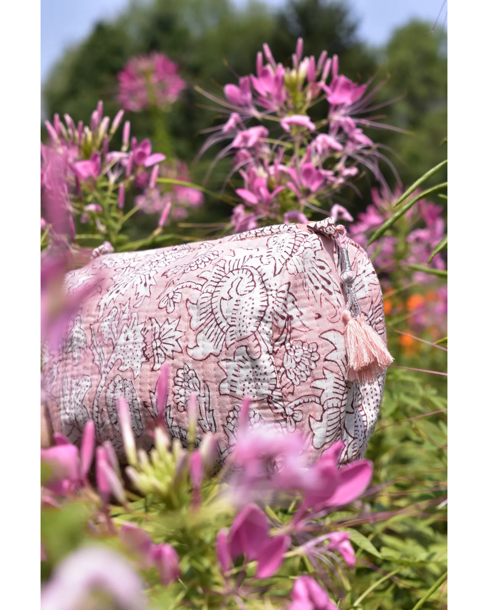 Our set of 3 nesting cosmetic pouches is the perfect companion for your travel and organization needs. Each pouch is hand block printed and features a waterproof lining and internal pockets to keep your essentials neatly organized and protected from spills.