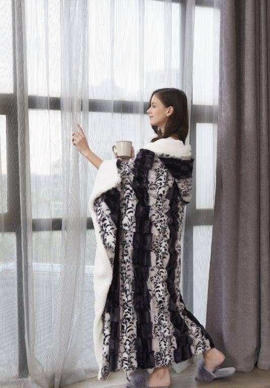 Virah Bella ® Collection Faux Fur™ Hooded Sherpa Throw. Adorable meets comfortable, all warmly wrapped into one unforgettable throw. Our line of Hooded Sherpa throws includes original designer themes and popular color combinations to suit every taste and decor style. Luxuriously soft with extra thick loft, these throws are made with 100% EF-Velboa Micro Polyester. Each throw is packaged in a clear poly bag for easy display and sale. Attractive product photo and care instructions included.