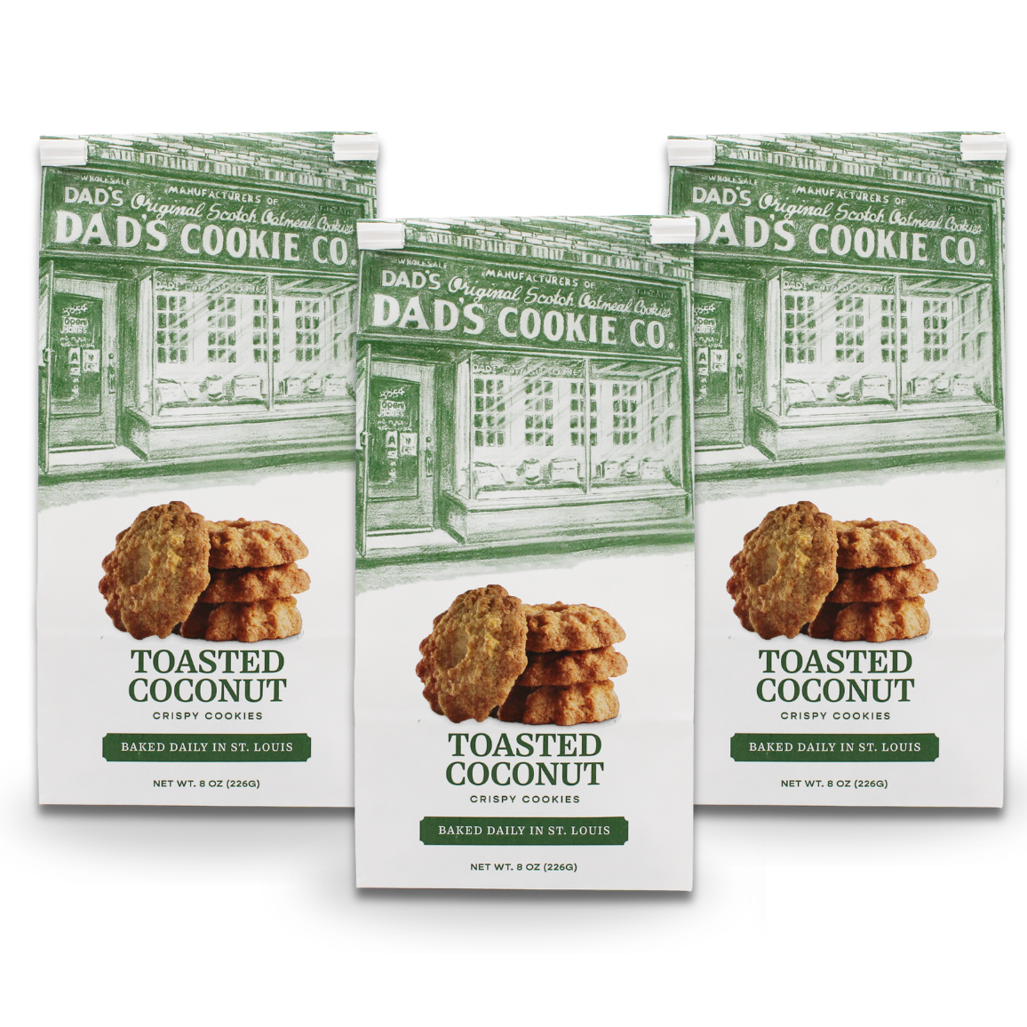 Dad’s Cookie Co. has been baking cookies since 1927. These beloved toasted coconut cookies are proudly baked and packed by hand at our iconic storefront bakery, sketched on the front of our bags, in south St. Louis city.