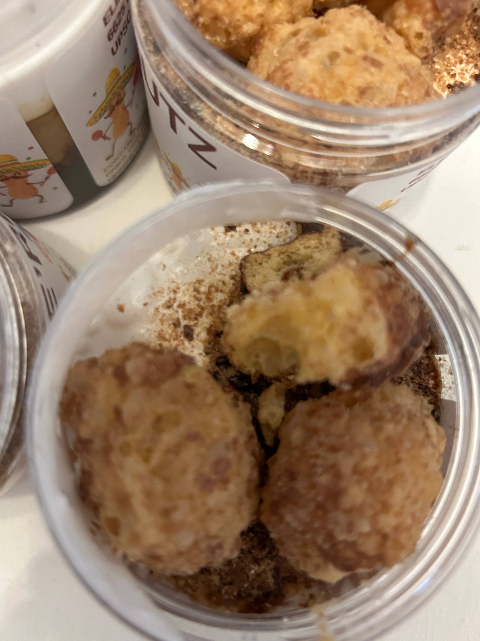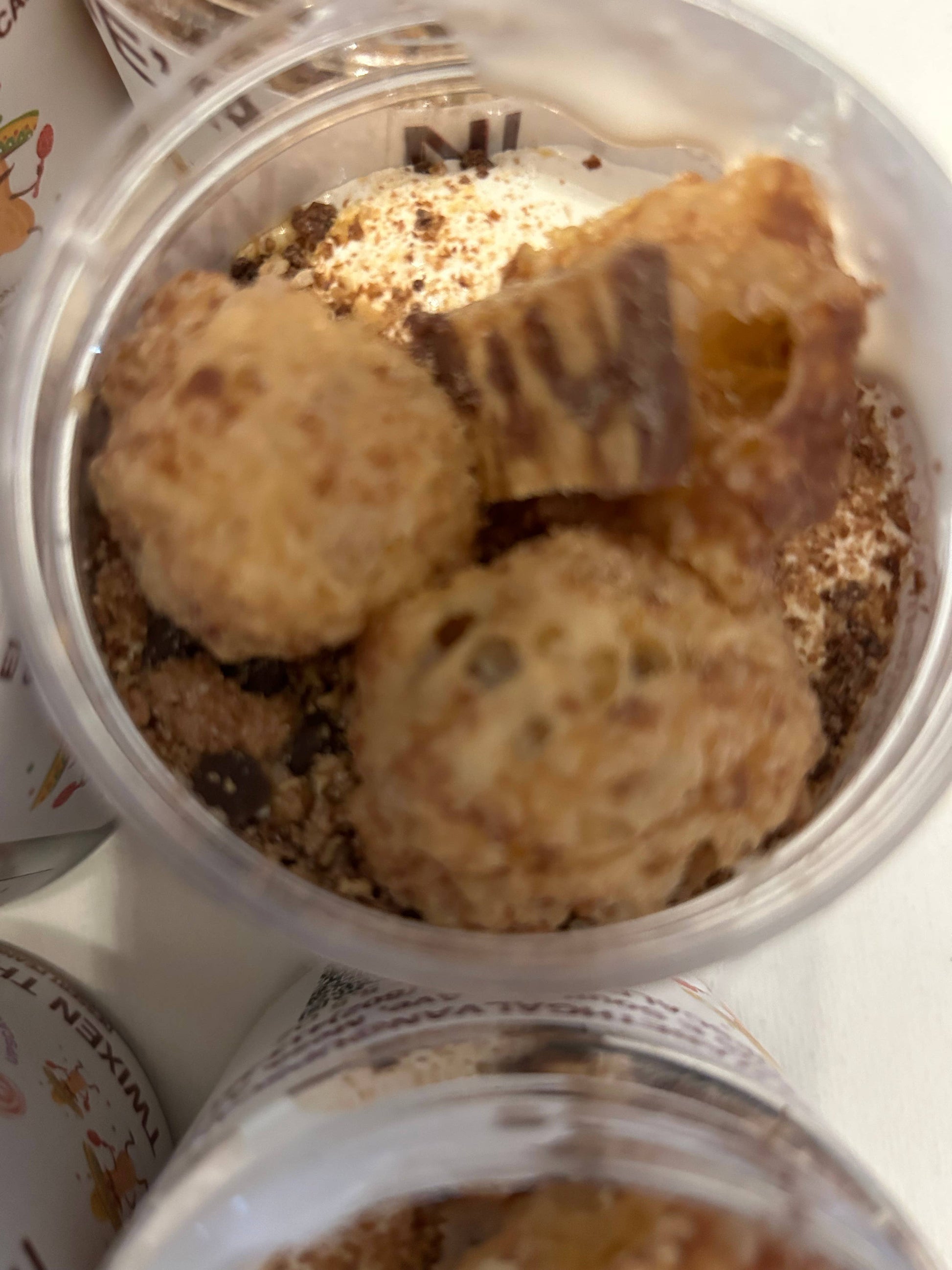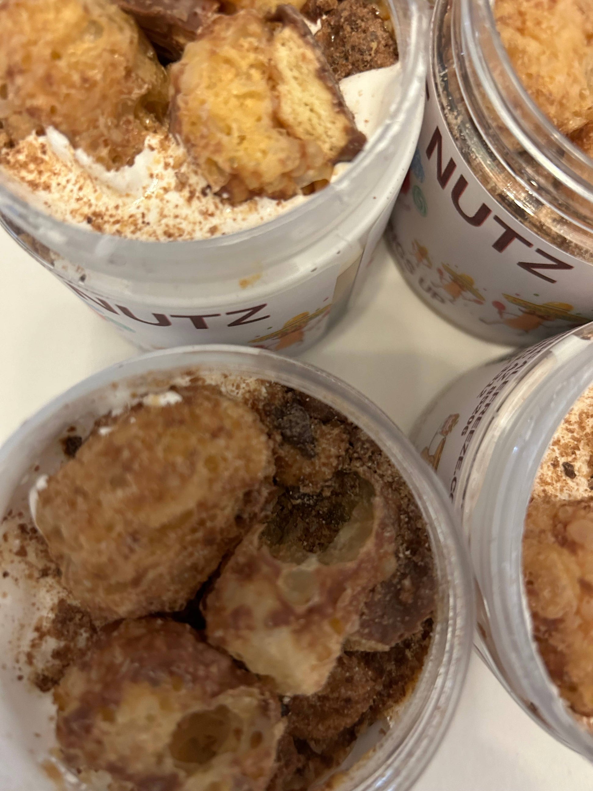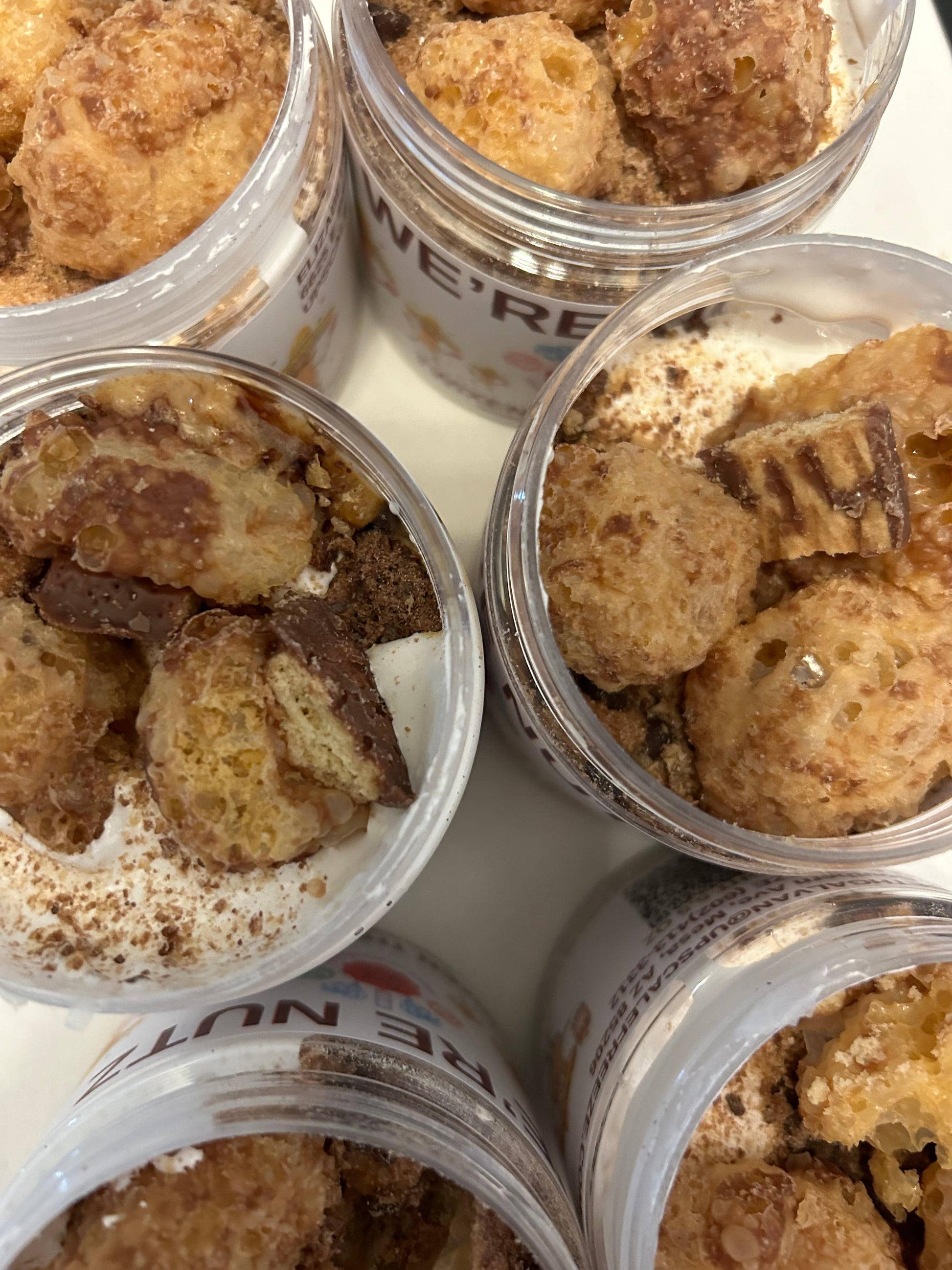 This dessert peanut butter has a honey nut base, with caramel sauce, chocolate sauce, chocolate chips, graham crackers, marshmallow fluff, freeze dried Twix, freeze dried milk duds