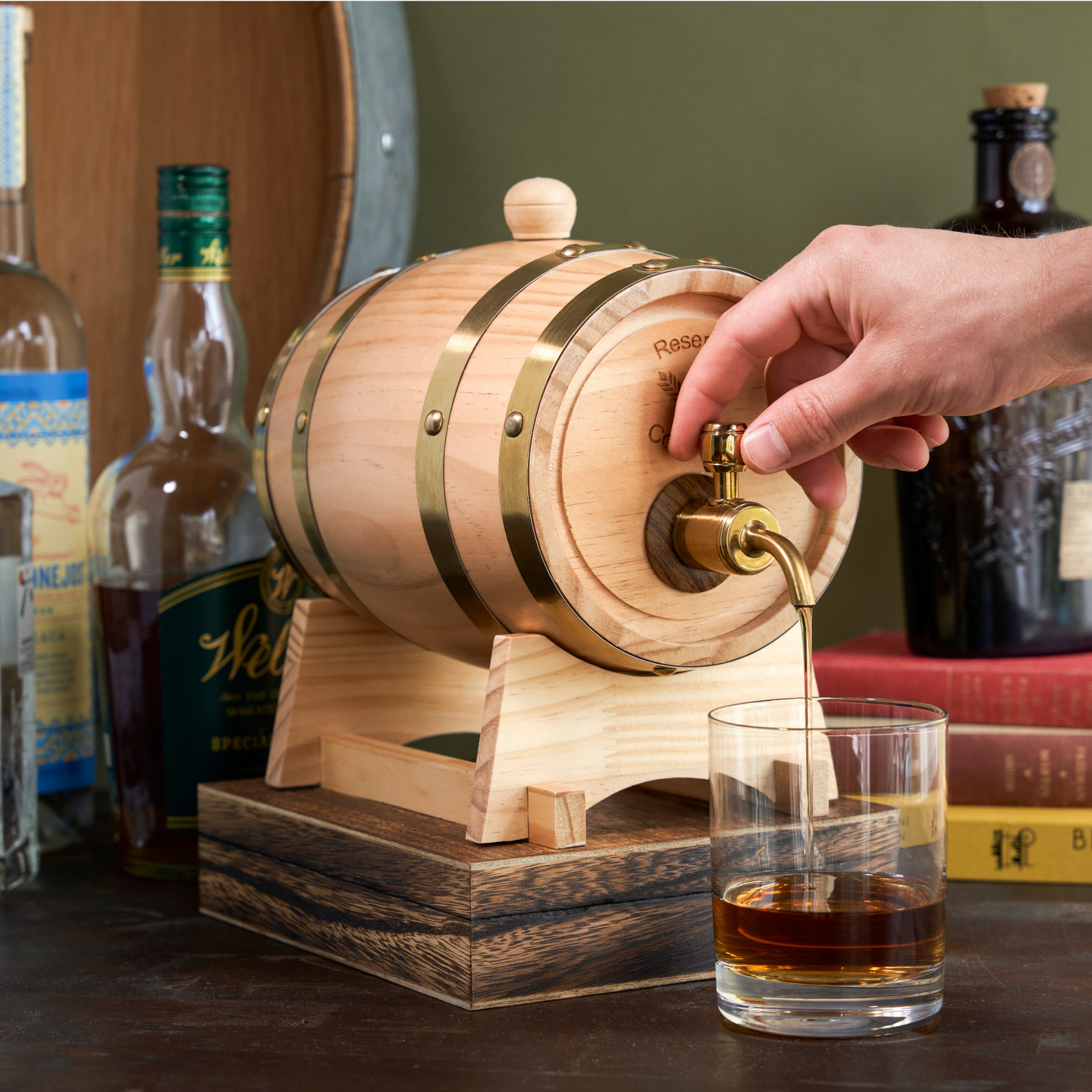 Turn your home bar into a distillery with this vintage-inspired whiskey barrel drink dispenser. This small wooden barrel holds one standard bottle of your favorite liquor and includes gold metal accents, a handy spigot, matching wood stand and stopper, and a funnel for easy filling. Try adding herbs and spices to infuse your spirits if you wanna get fancy.
